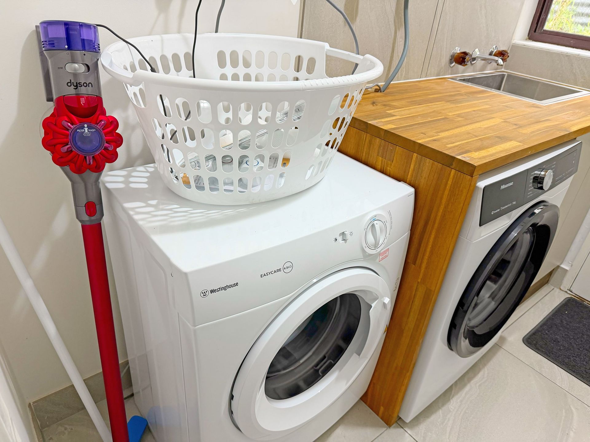The fully equipped modern kitchen has all the appliances and utensils you’ll need to whip up everything from lazy breakfasts to seafood feasts. You’ll also find a washer and dryer for convenience during longer stays.