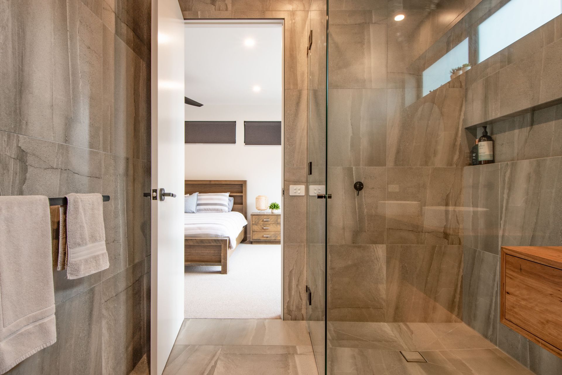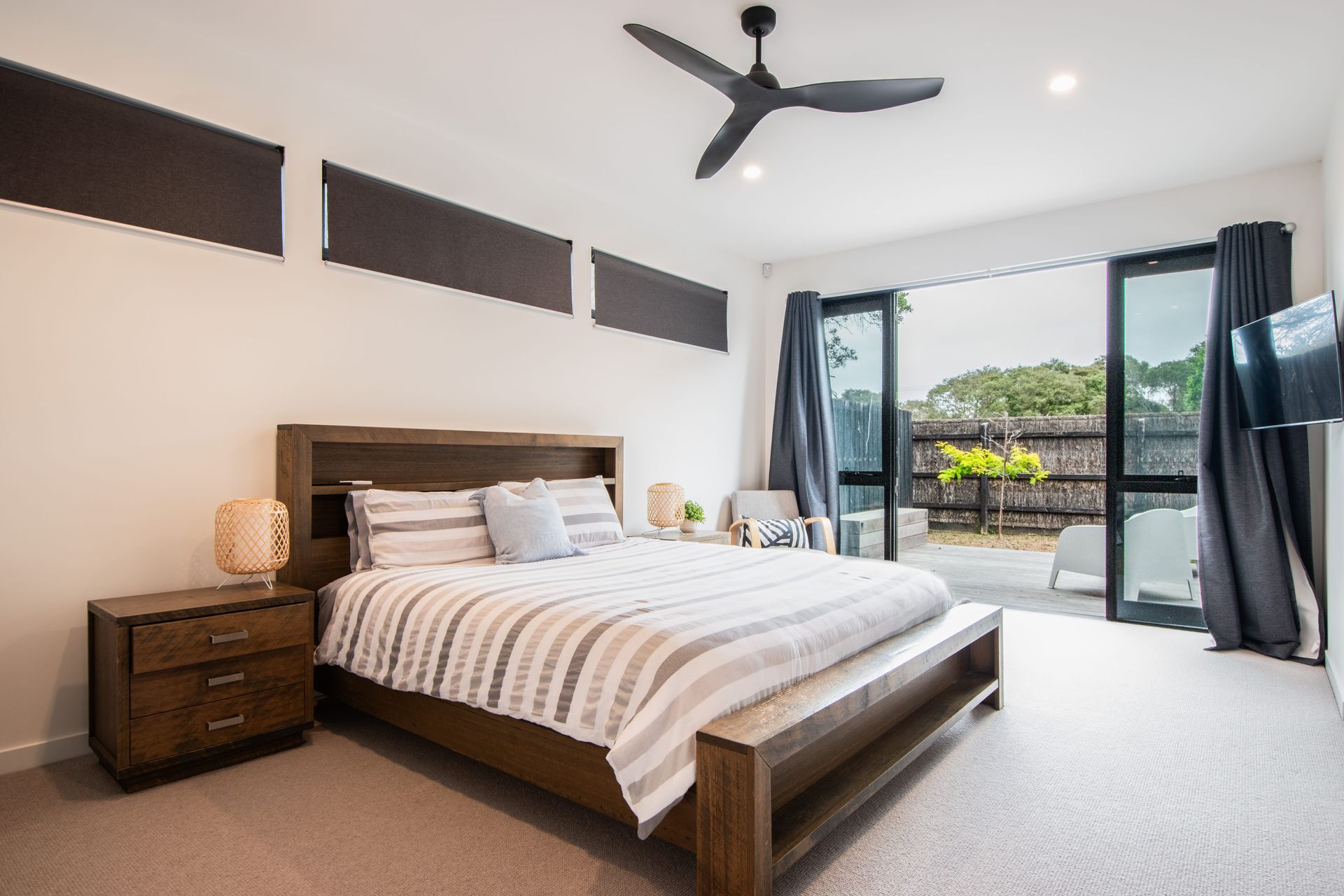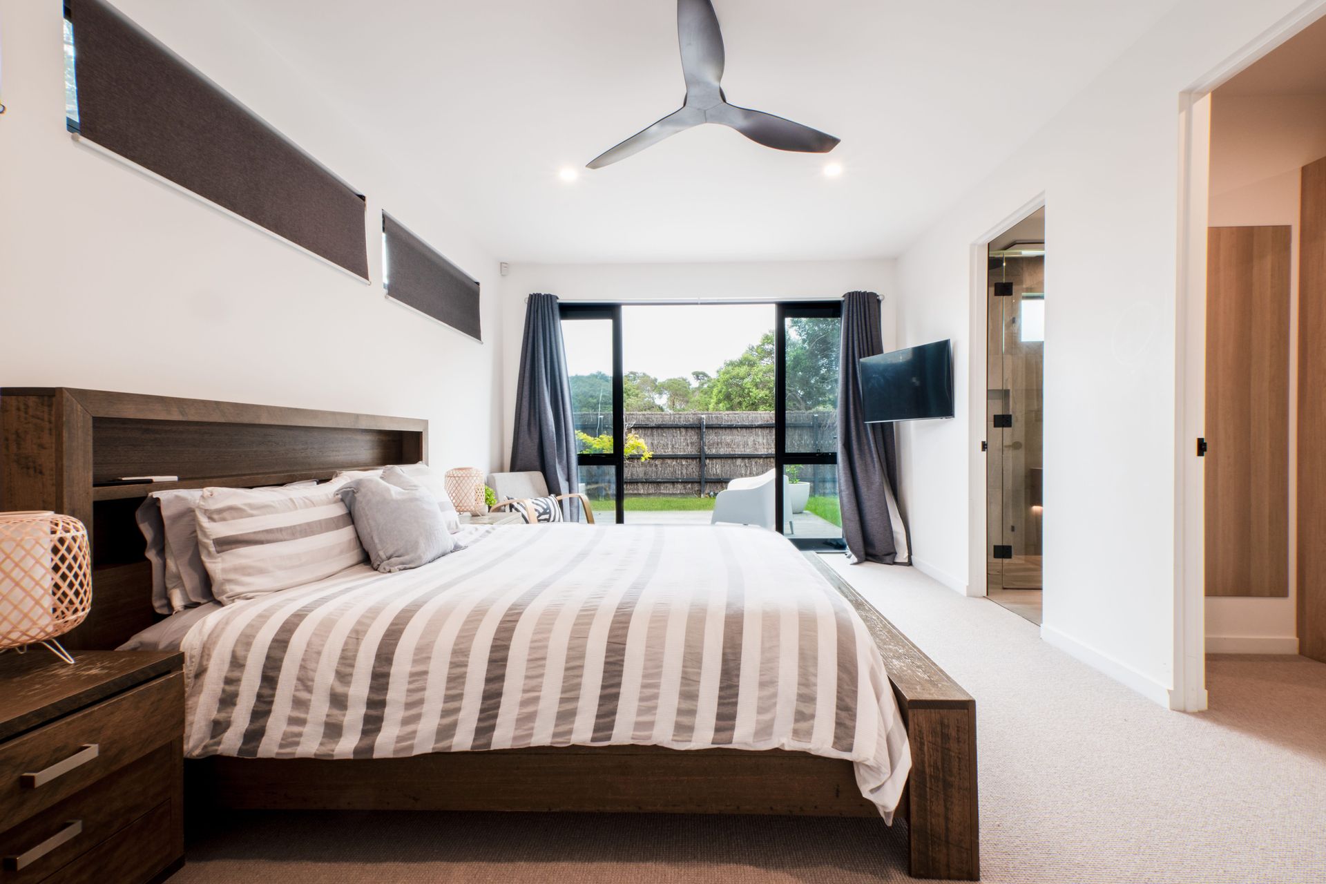 Bedroom 5: Master Retreat: King bed, TV, ensuite bathroom with shower, toilet and double basin, walk-in-robe, and private deck.